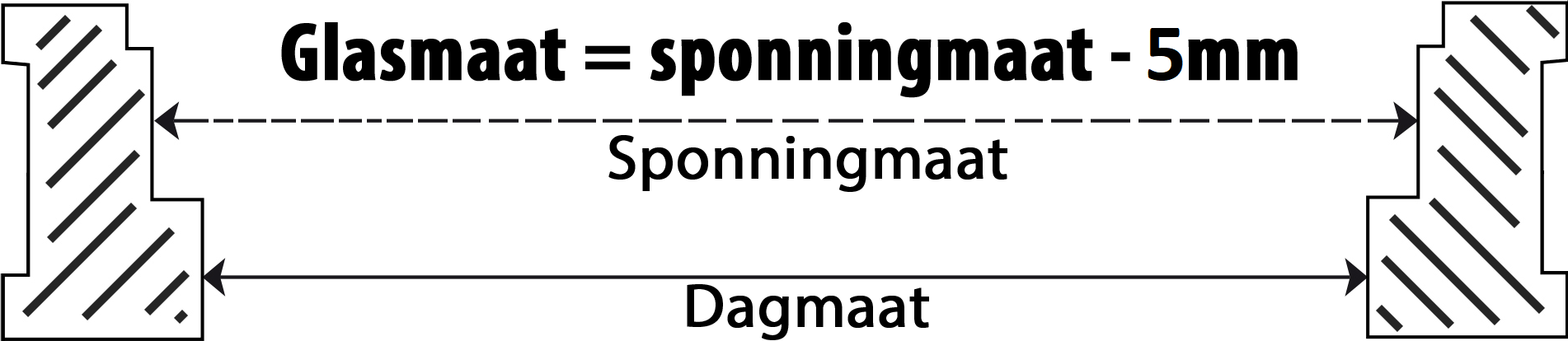 De dagmaat is de maat van de ruit die je daadwerkelijk ziet. Voor het vervangen van een bestaande ruit meet je de ruit aan de binnenzijde (zogenaamde dagmaat) van het kozijn en telt hier vervolgens 22 mm (2,2 cm) bij op om de glasmaat te krijgen. (22 mm = de benodigde ruimte dat het glas in de sponning valt en de benodigde ventilatieruimte)